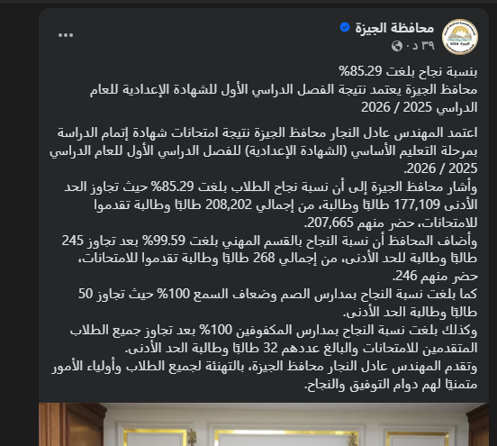 ‏إليكم الآن كل ما يتعلق بـ نتيجة الشهادة الإعدادية محافظة الجيزة 2026، حيث تم اعتماد النتائج رسميا خلال الساعات الماضية ‏من قبل المهندس عادل النجار المحافظ الجيزة بنسبة نجاح بلغت نحو 85.29%، حيث تجاوز الحد الأدنى 177,109 طالبًا وطالبة، من إجمالي 208,202 طالبًا وطالبة تقدموا للامتحانات، حضر منهم 207,665، اما نسبة النجاح بالقسم المهني بلغت 99.59%، وكما بلغت نسبة النجاح بمدارس الصم وضعاف السمع 100%.