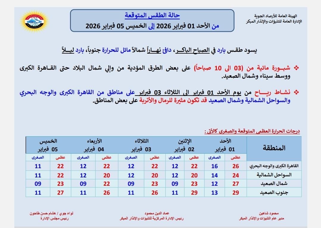 أعلنت ‏الهيئة العامة للأرصاد الجوية حالة الطقس غدا الأحد 1 فبراير 2026 استشهد شبورة مائية على بعض الطرق المؤدية من وإلى شمال البلاد بالإضافة إلى نشاط للرياح على مناطق من القاهرة الكبرى والوجه البحري كما يسود غدا طقس بارد في الصباح الباكر و دافئ نهارا وما للحرارة جنوبا وبارد ليلا، ومن المتوقع أن تسجل درجة الحرارة غدا في القاهرة والوجه البحري 26 عظمة 16 سكوب وفي السواحل الشمالية 24 عظمة 14 صغرى، وفي السواحل الشمالية 24 للعظم ى و14 للصغرى، فدعونا الان خلال موقعنا الاخباري نعرض لكم تفاصيل حالة الطقس غدا .