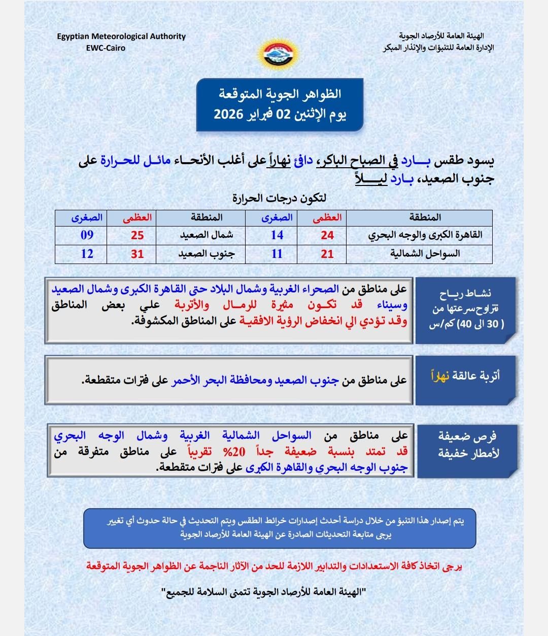 اعلنت الهيئة العامة للأرصاد الجوية أن حالة الطقس غدا الاثنين 2 فبراير 2026 ستشهد نشاط للرياح تتراوح سرعتها من 30 إلى 40 كيلو متر على الساعة على مناطق من الصحراء الغربية وشمال البلاد حتى القاهرة الكبرى وشمال الصعيد، وقد تكون مثيرة للرمال والأتربة على بعض المناطق وقد تؤدي إلى انخفاض رؤية الأفقية على المناطق المكشوفة، بالإضافة إلى اتربة عالقة نهارا على مناطق من جنوب الصعيد ومحافظة البحر الأحمر على فترات متقطعة وفرص أمطار ضعيفة لأمطار خفيفة على مناطق من السواحل الشمالية الغربية وشمال الوجه البحري قد تمتد بنسبة حدوث 20% تقريبا على مناطق متفرقة من جنوب البحري والقاهرة الكبرى على فترات متقطعة كم سيسود اليوم طقس بارد في الصباح الباك على اغلب الأنحاء مائل إلى الحرارة على جنوب الصعيد وبارد ليلا.