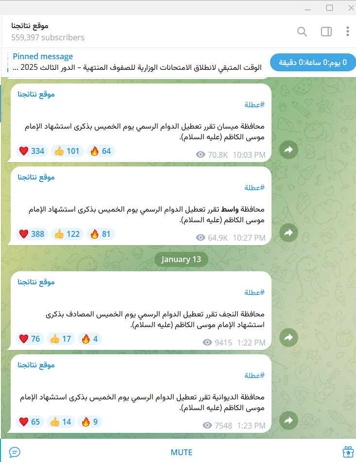 (نعم)، أعلنت الأمانة العامة ان يوم الخميس الموافق 15 يناير 2026 عطلة رسمية في العراق بمناسبة ذكرى استشهاد الإمام موسى الكاظم عليه السلام، التي تعتبر من المناسبات التي تشهد سنويًا فعاليات دينية واسعة، أبرزها الزيارات المليونية، وذلك بمحافظة (ميسان، وواسط، والنجف، والديوانية).