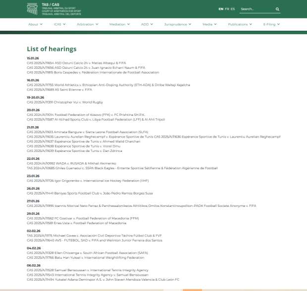 أصدرت المحكمة الرياضية الدولية «كاس» تحديثًا حول جلسات الاستماع المتعلقة بالقضايا الرياضية على مستوى العالم ويأتي ذلك في ظل انتظار موقف القضية المرفوعة من نادي بيراميدز ضد رابطة الأندية المصرية والاتحاد المصري لكرة القدم للمطالبة بسحب درع الدوري المصري من النادي الأهلي.