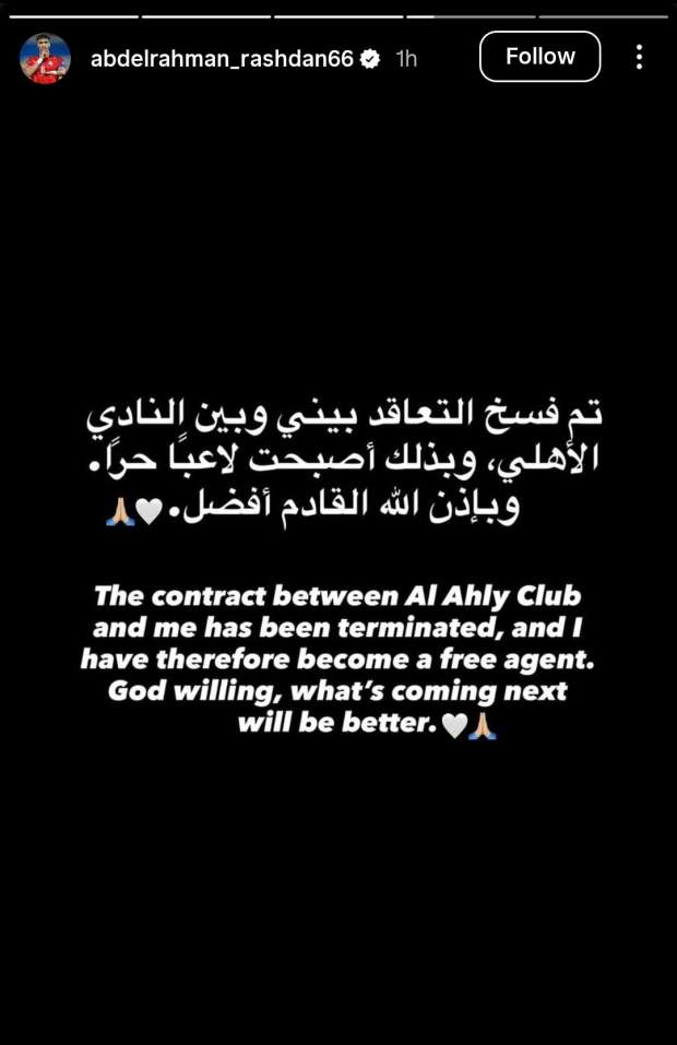 كتب عبدالرحمن رشدان عبر حسابه الشخصي على منصة إنستجرام أنه تم فسخ التعاقد بينه وبين النادي الأهلي بالتراضي وأصبح لاعبًا حرًا متمنيًا الأفضل في المستقبل.