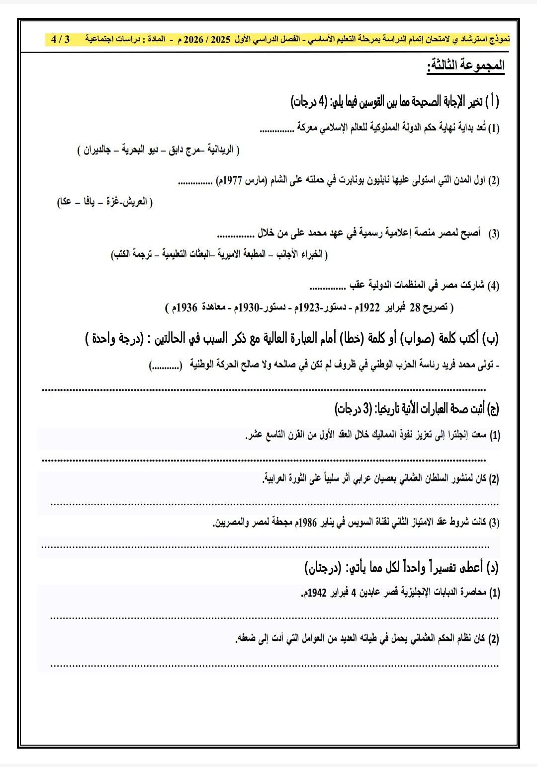 نموذج اجابة امتحان الدراسات الاجتماعية الصف الثالث الاعدادي 2026