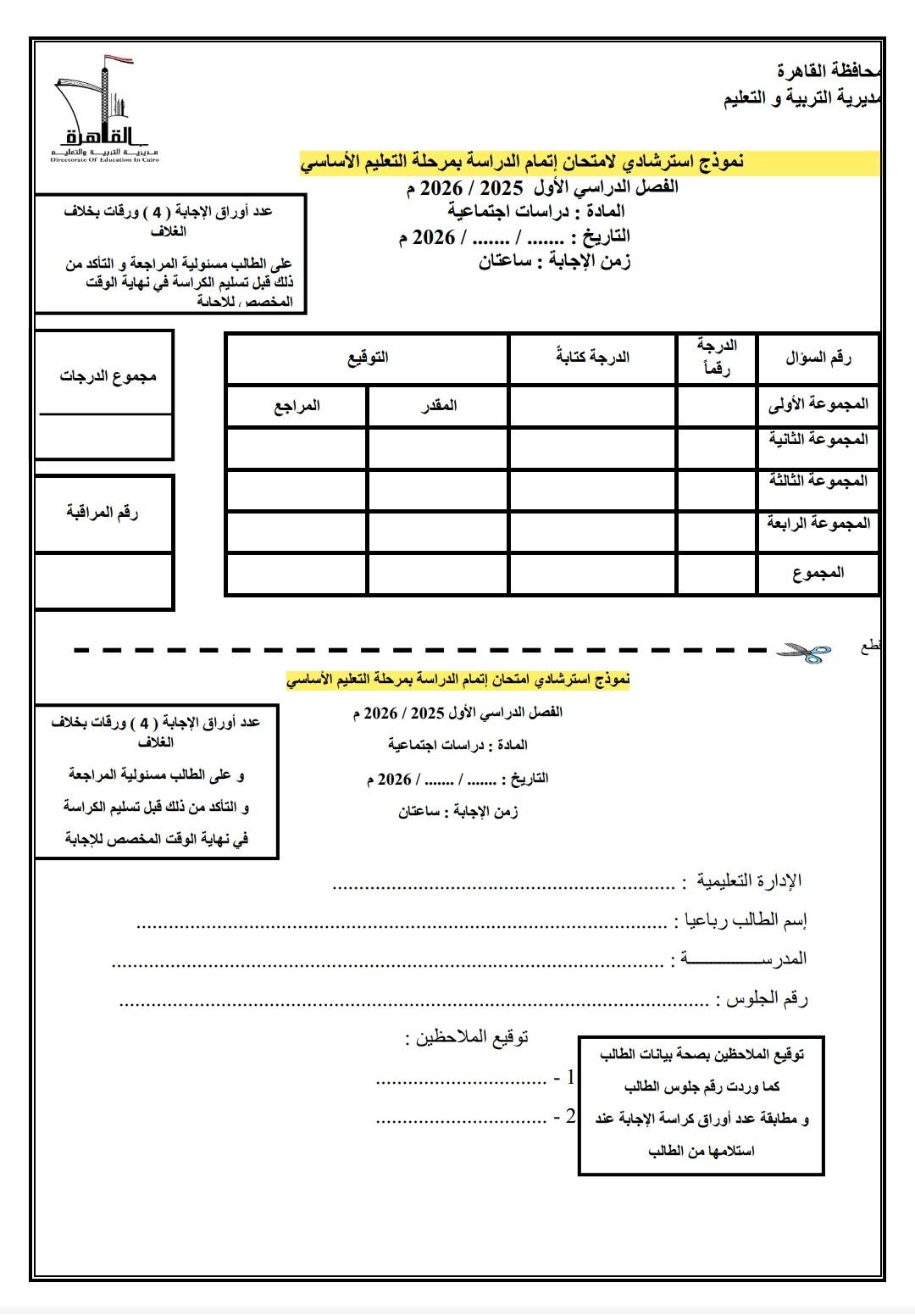 جدول امتحانات الصف الثالث الإعدادي 2026 – محافظة القاهرة