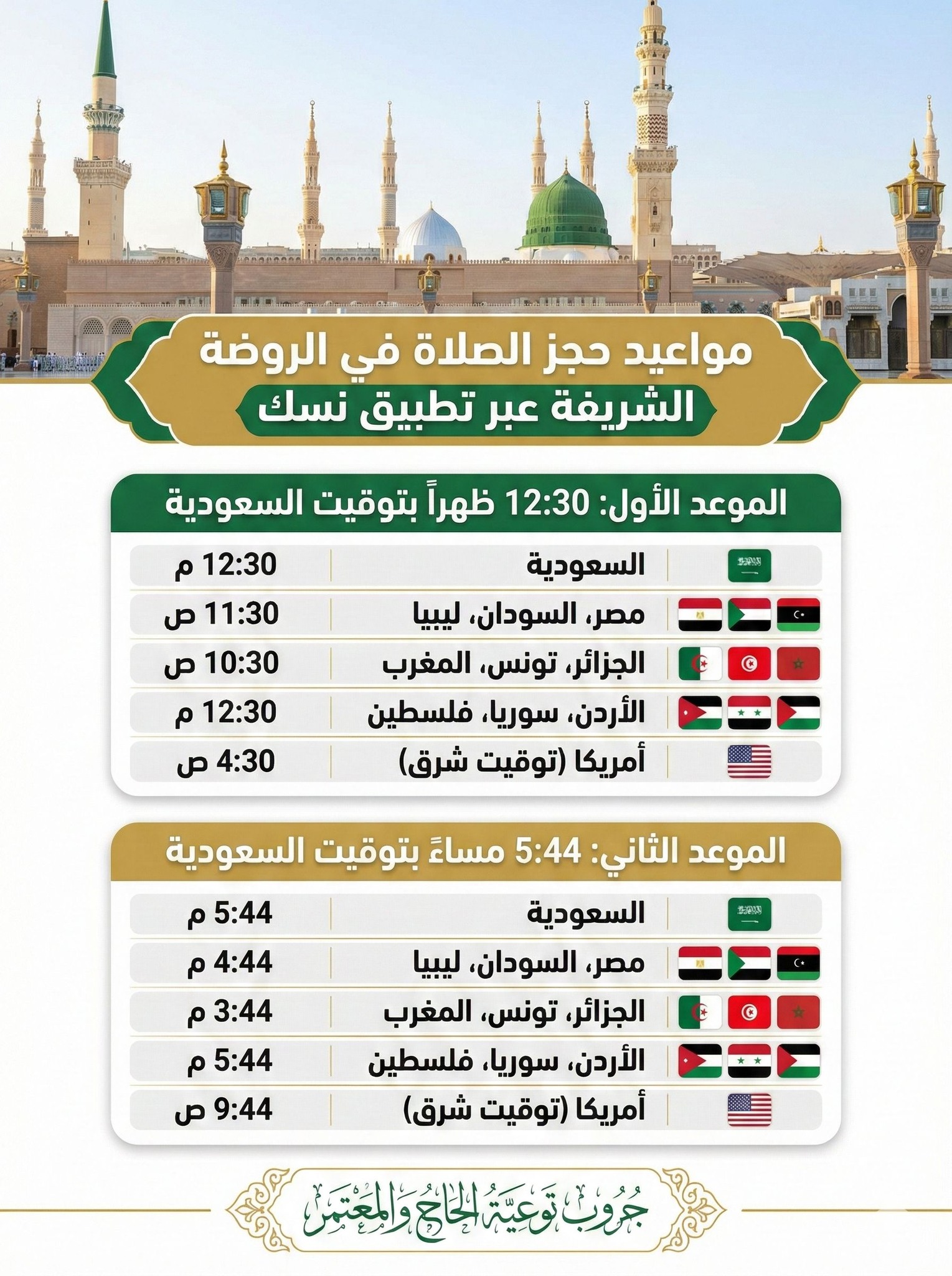 يبدأ أول موعد متاح لحجز الصلاة في الروضة الشريفة عبر تطبيق نسك في الأوقات التالية حسب الدولة: