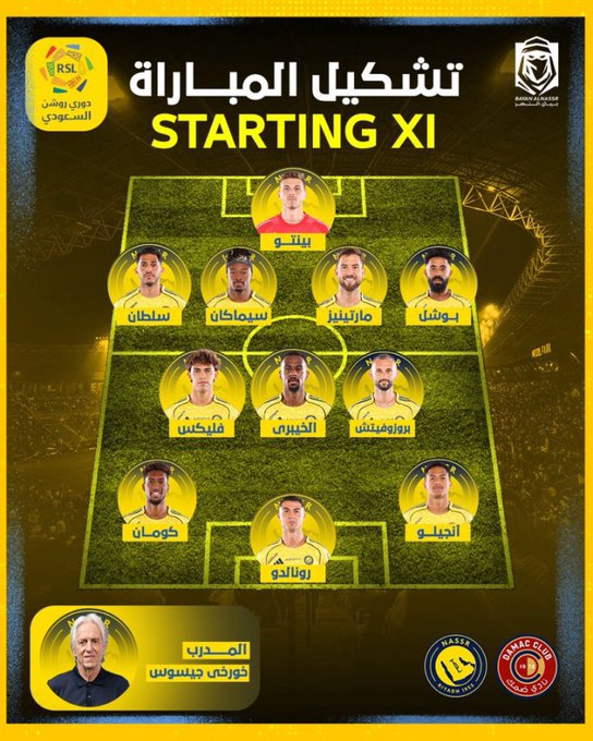 أعلن خورخي جيسوس المدير الفني لنادي النصر عن التشكيل الرسمي الذي يخوض به مواجهة ضمك، حيث يعتمد على الحارس بينتو في حراسة المرمى، وأمامه في الخط الخلفي كل من سلطان الغنام ومحمد سيماكان وإينيجو مارتينيز ونواف بوشل، بينما يتواجد في خط الوسط مارسيلو بروزوفيتش إلى جانب عبد الله الخيبري وجواو فيليكس، وفي الخط الأمامي يقود الهجوم النجم البرتغالي كريستيانو رونالدو مدعومًا بالسرعة والقوة الهجومية لكل من كينجسلي كومان وأنخيلو، في توليفة هجومية تعكس نية النصر في حسم المباراة مبكرًا.