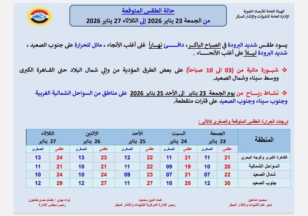 ‏أما بالنسبة إلى حالة الطقس غدا الجمعة 23 يناير 2026 فستشهد شبورة مائية من 3:00 صباحا حتى 10:00 صباحا على بعض الطرق المؤدية من وإلى شمال البلاد حتى القاهرة الكبرى ووسط وشمال الصعيد بالإضافة إلى نشاط الرياح على مناطق من السواحل الشمالية الغربية وجنوب سيناء وجنوب الصعيد على فترة متقطعة كم سيسود طقس شديد البرودة في الصباح الباكر دافئ نهارا على اغلب لأنحاء ومائل للحرارة على جنوب سيناء شديد البرودة ليلا على أغلب أنحاء.