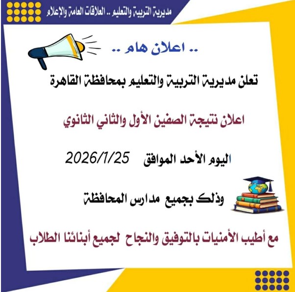 أعلنت مديرية التربية والتعليم أن نتيجة الصف الأول والثاني الثانوي 2026 سيتم إعلانها داخل المدارس يوم الأحد 25 يناير عقب اعتمادها رسميًا من الإدارات التعليمية وأوضحت المديرية أنه خلال نفس الأسبوع سيتم رفع النتائج تباعًا على بوابة التعليم الإلكتروني لتكون متاحة أمام الطلاب إلكترونيًا ويأتي ذلك في إطار التيسير على الطلاب وأولياء الأمور وتقليل التكدس داخل المدارس مع ضمان دقة البيانات وشفافية عرض الدرجات.
